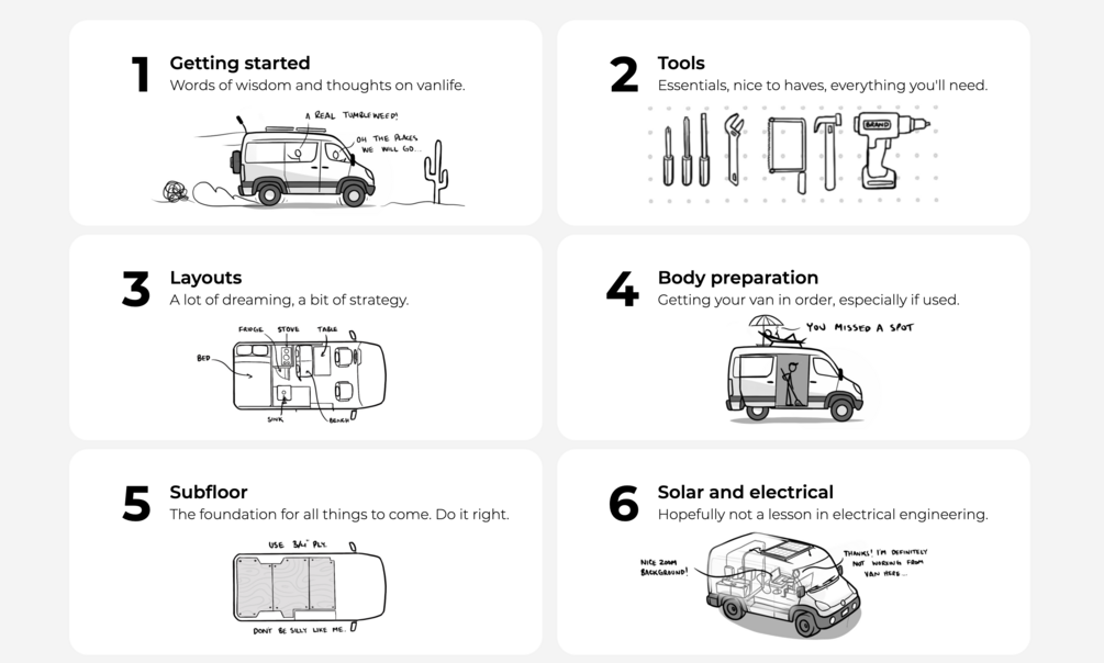 A guide that'll empower you to convert your van into a tiny home, and silly illustrations that make everything more digestible (and fun).
